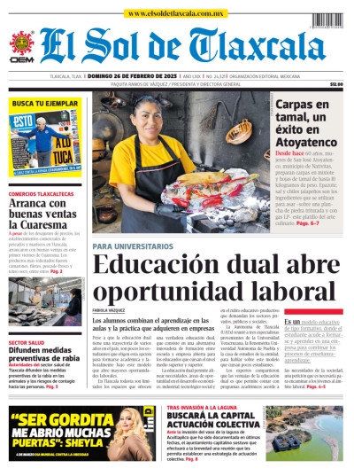 CategorÃas : CulturaPoliciacaPoliticaSaludEl Sol de Tlaxcala es el periódico lÃder en el estado y contribuye al desarrollo humano, económico y social de la comunidad. Somos un diario que ayuda a sus lectores a comprender su entorno inmediato, por medio de información práctica útil y de actualidad.
