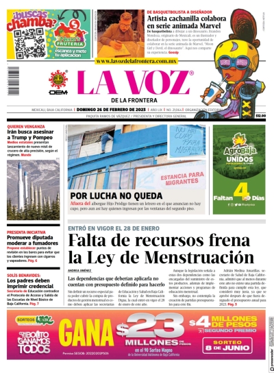 Categorías : DeportesEntretenimientoNoticiasCon más de medio siglo en el mercado, es el periódico con más venta de publicidad gracias a que goza de la preferencia de los mexicalenses. La Voz de la Frontera atrae desde su fundación en 1964 a los lectores de mayor poder adquisitivo, quienes toman las decisiones. Sin embargo, no es un diario de minorías ni exclusivo de las élites, sino que llega a la fuerza de producción y sustento de la sociedad, quien ejecuta los cambios que mueven la región.